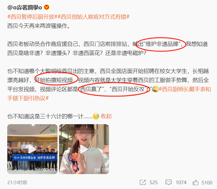 最后,再说说今天最新动态。有网友发博表示,西贝的合作商到门店摆拍“维护非遗品牌”?和招聘美女拍短视频,并配评论“西贝赢了”?这这这...网友们评论:都是啥操作啊?