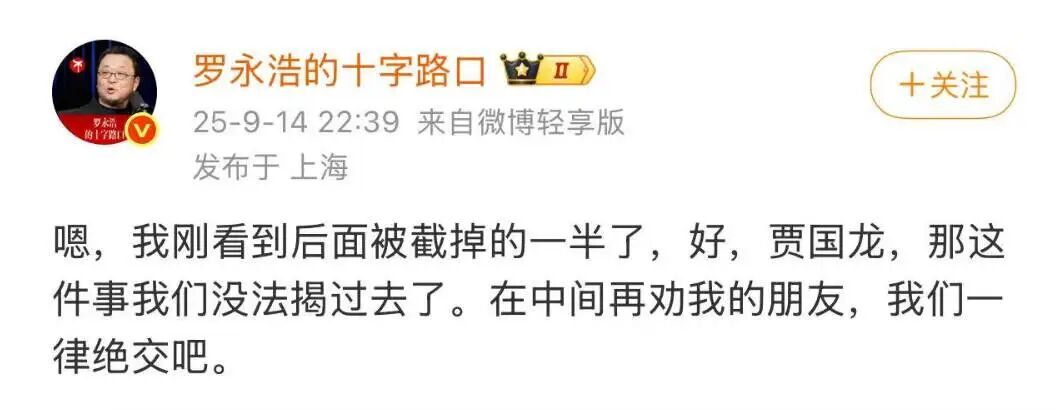 罗永浩得知此事后,原本认可这一态度。结果昨晚他才发现,该截图还有后半部分——贾国龙竟直称“罗永浩是网络黑嘴,是网络黑社会,太坏了”。