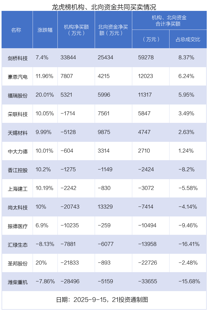 值得注意的是,机构和北向资金共同净买入了剑桥科技、福瑞股份、豪恩汽电等3股;共同净卖出了振德医疗、上海建工、圣邦股份、香江控股、潍柴重机、汇绿生态等6股;在尚太科技,天赐材料,荣联科技,中大力德上出现分歧,机构净卖出尚太科技2.07亿元,北向资金净买入1.33亿元;机构净卖出天赐材料5128.31万元,北向资金净买入9875.16万元;机构净卖出荣联科技1714.25万元,北向资金净买入7560.93万元;机构净卖出中大力德603.84万元,北向资金净买入3313.5万元。