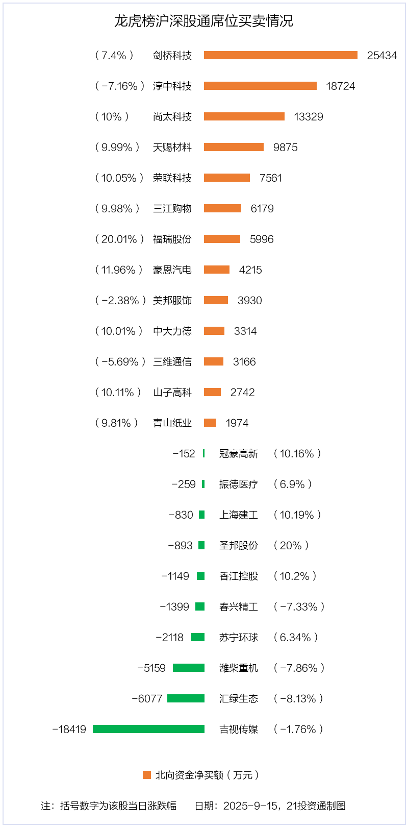 9月15日,上证指数下跌0.26%,深证成指上涨0.63%,创业板指上涨1.52%。盘后龙虎榜数据显示,共有46只个股因当日异动登上龙虎榜,资金净流入最多的是剑桥科技(603083.SH),达7.98亿元。
