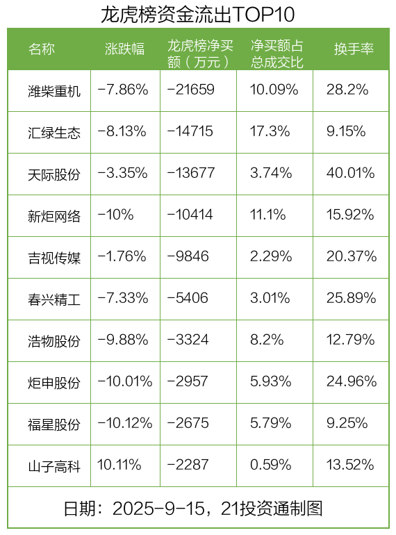 而龙虎榜中资金净流出最多的是潍柴重机(000880.SZ),被净卖出为2.17亿元,占总成交金额的10.09%。潍柴重机收盘下跌7.86%,换手率为28.2%。