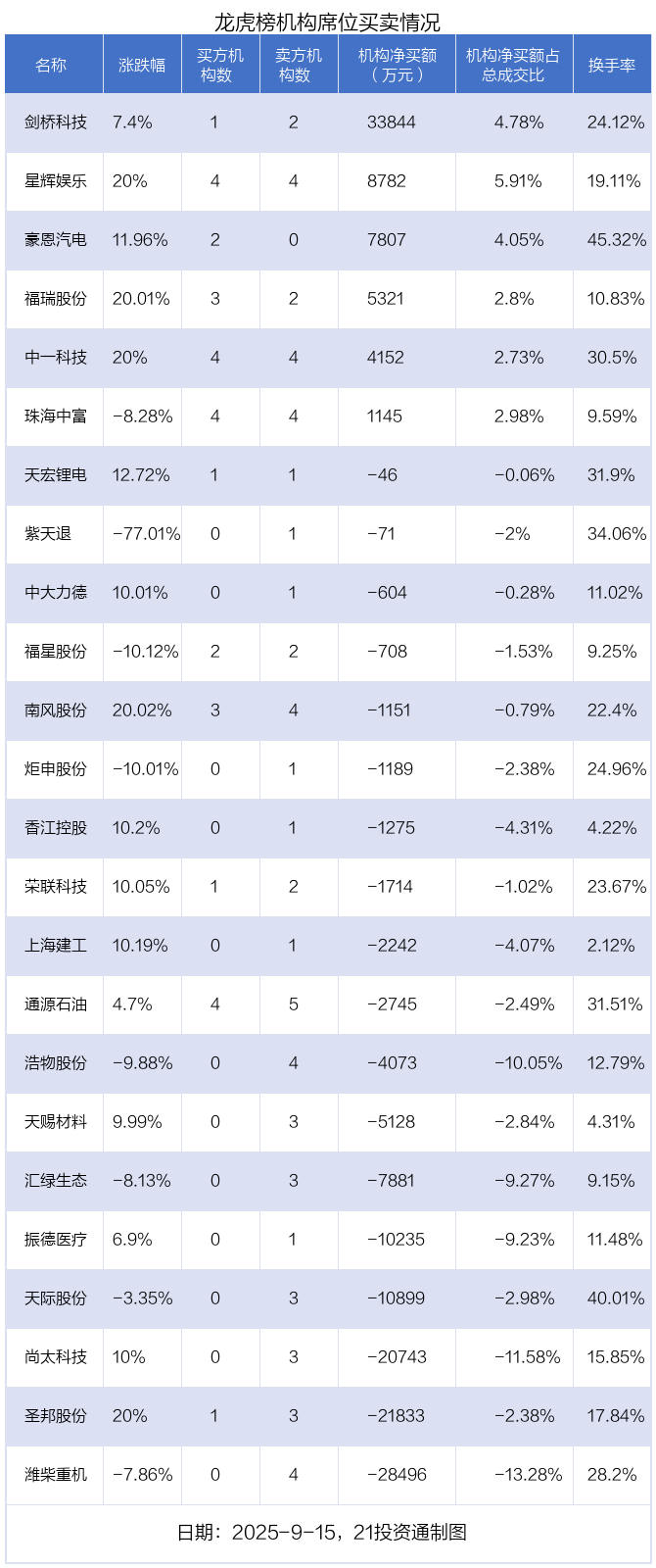 9月15日,24只个股龙虎榜出现了机构的身影,机构合计净卖出6亿元。具体来看,机构净买入6股,净卖出18股。