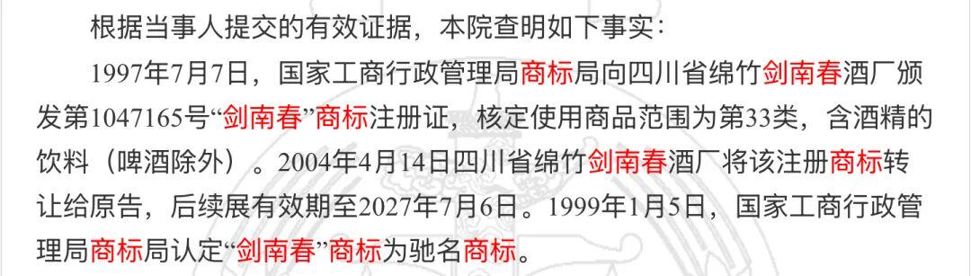 2004年4月14日四川省绵竹剑南春酒厂将该注册商标转让给原告,后续展有效期至2027年7月6日。1999年1月5日,国家工商行政管理局商标局认定“剑南春”商标为驰名商标。