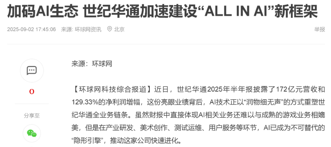 近期的相关报道中,世纪华通称AI在用“润物细无声”的方式重塑公司产业链条。
