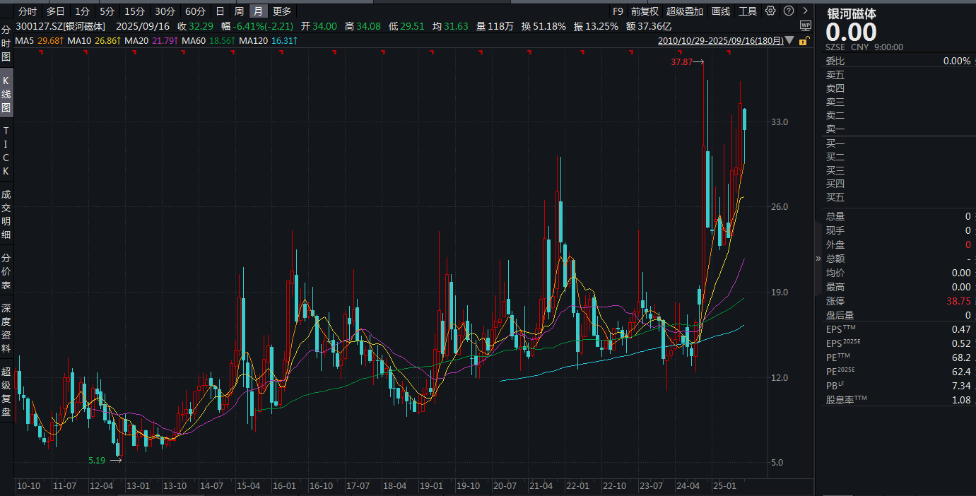 2024年9月18日,银河磁体股价最低跌至12.37元(前复权),此后短短两个月时间最高升至37.87元。