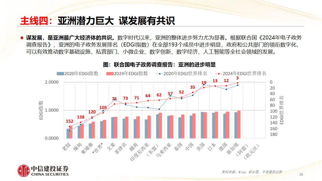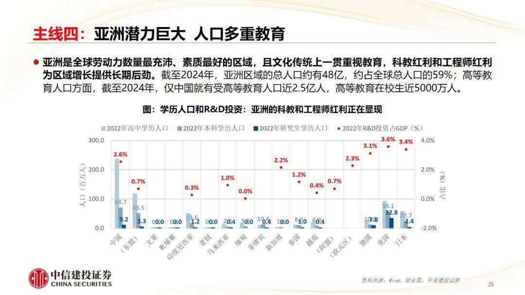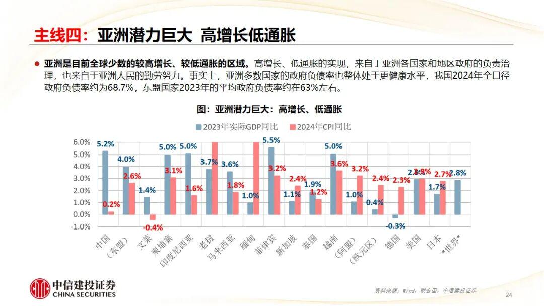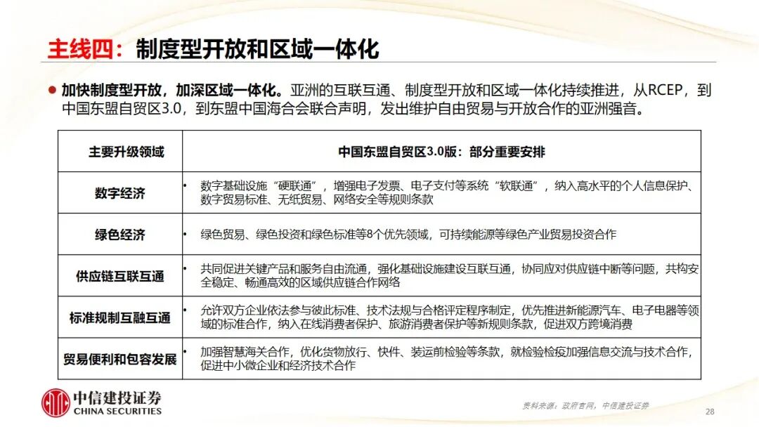 主线四:贸易市场。亚洲潜力巨大;全球贸易和产业链核心;制度型开放和区域一体化。