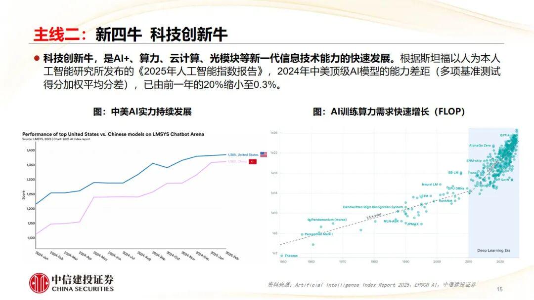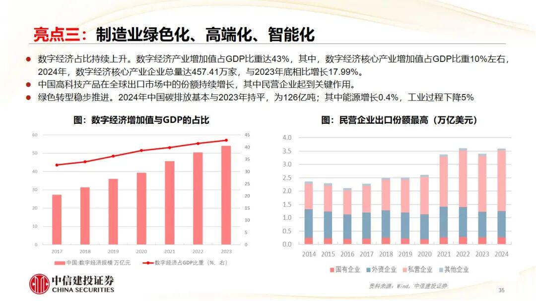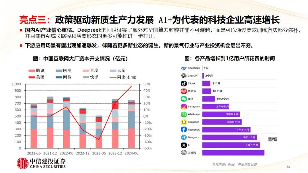 亮点三:政策驱动新质生产力发展。产业结构升级是经济增长的主线任务;“两重”“两新”集中发力;AI+为代表的科技企业高速增长;制造业绿色化、高端化、智能化。