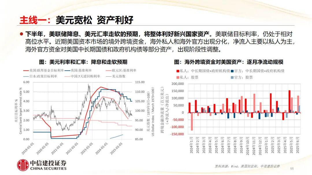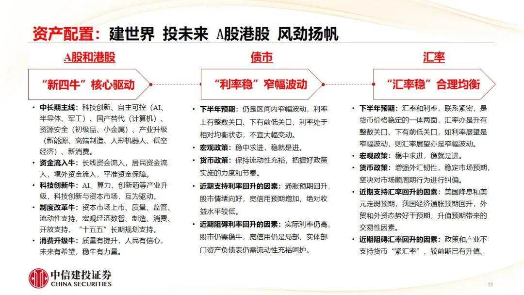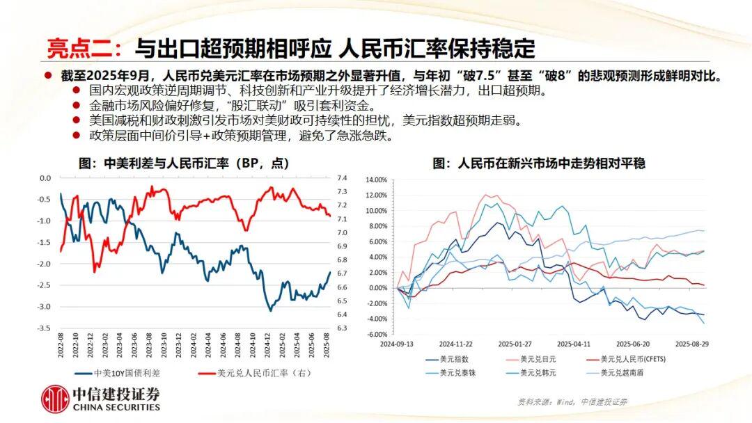 国内高质量成长,创新支撑,韧性显现,四大亮点超预期。一是关税战中的出口韧性。二是人民币汇率保持稳定。三是政策驱动新质生产力发展。四是消费“新浪潮”与中国香港国际贸易金融中心地位。