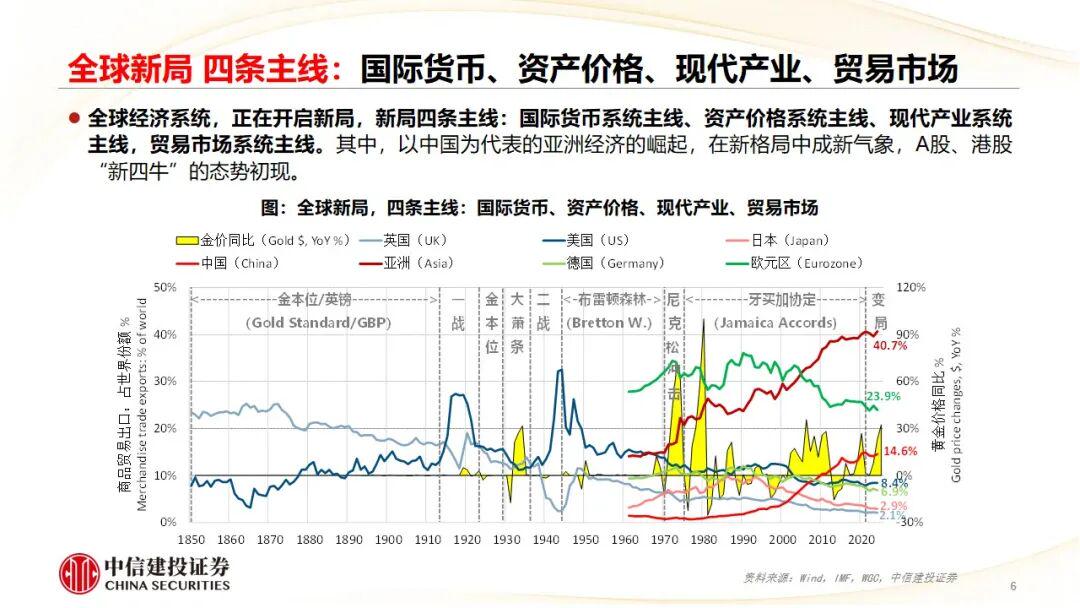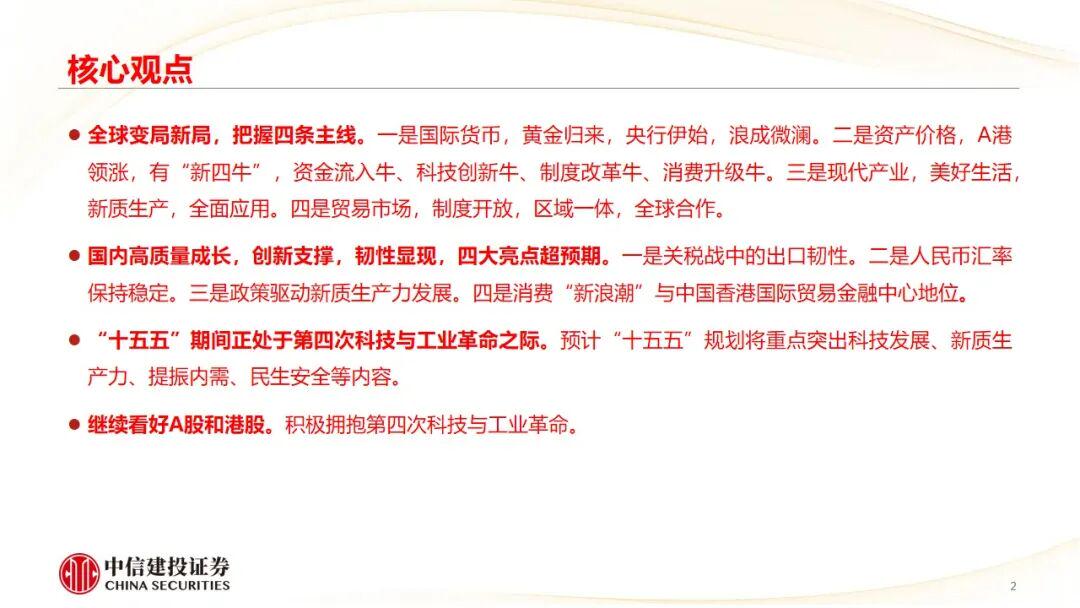 全球变局新局,把握四条主线。一是国际货币,黄金归来,央行伊始,浪成微澜。二是资产价格,A港领涨,有“新四牛”,资金流入牛、科技创新牛、制度改革牛、消费升级牛。三是现代产业,美好生活,新质生产,全面应用。四是贸易市场,制度开放,区域一体,全球合作。