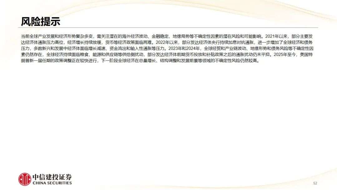 当前全球产业发展和经济形势复杂多变,需关注潜在的海外经济波动、金融稳定、地缘局势等不确定性因素的潜在风险和可能影响。2021年以来,部分主要发达经济体通胀压力高位,经济增长持续放缓,货币等经济政策面临两难。2022年以来,部分发达经济体央行持续加息对抗通胀,进一步增加了全球经济和债务压力,多数新兴和发展中经济体面临增长减速、资金流出和输入性通胀等压力。2023年和2024年,全球经贸和产业链波动、地缘形势和债务风险等不确定性因素仍然存在,全球经济持续面临粮食、能源和供应链等供给侧扰动,部分发达经济体前期货币投放和补贴政策之后的通胀扰动仍未平抑。2025年至今,美国特朗普新一届任期的政策调整正在较快进行,下一阶段全球经济在总量增长、结构调整和发展前景等领域的不确定性风险仍然较高。
