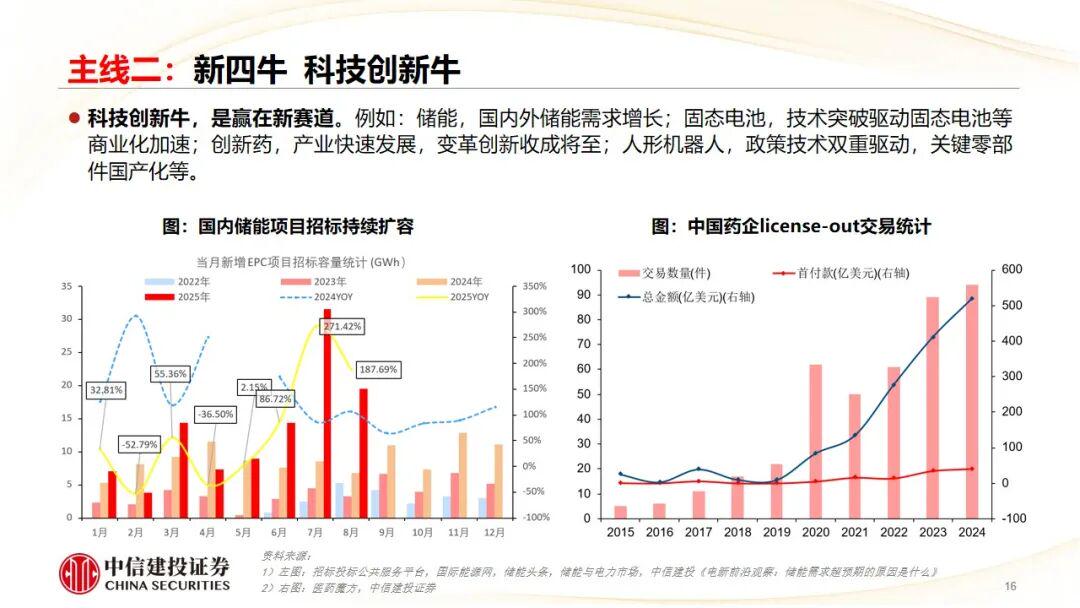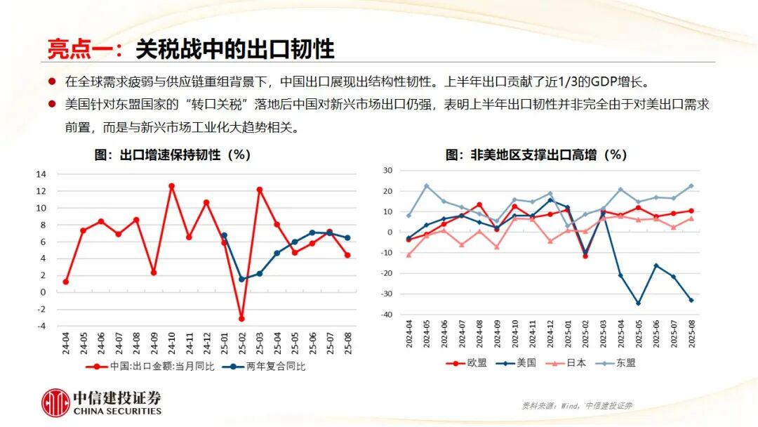 亮点一:关税战中的出口韧性。贸易结构优化,资本品与中间品出口增速显著走强,助力企业出海;设备投资周期回暖;我国在全球价值链中向上游攀升;区域产业分工深化。