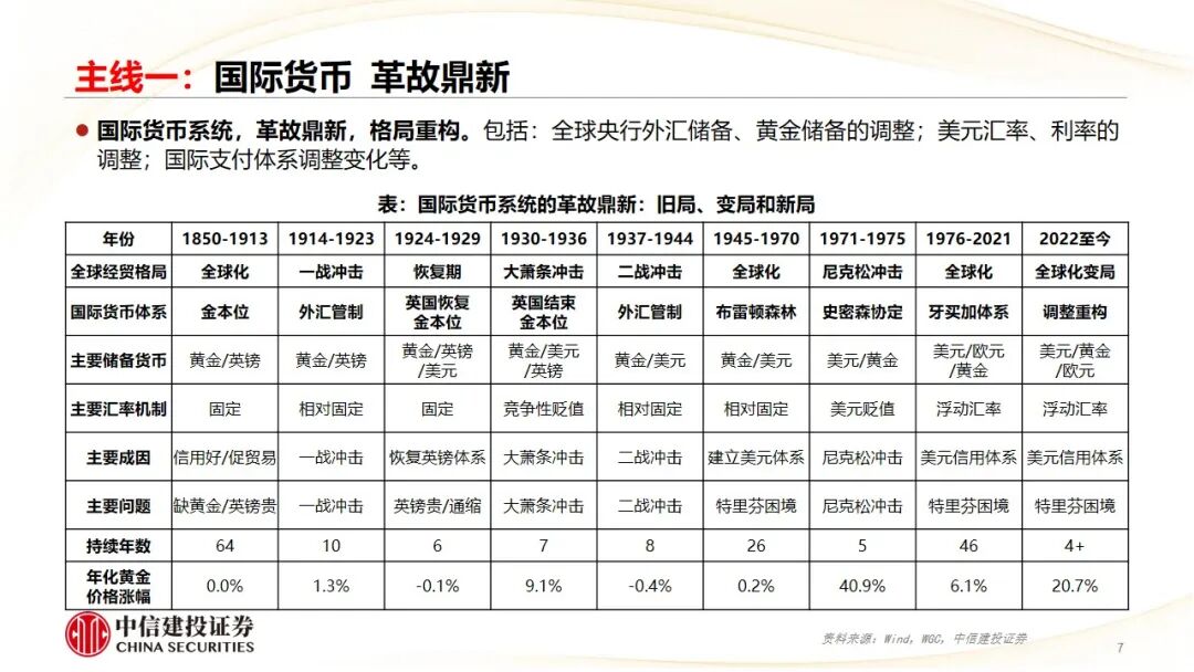主线一:国际货币。国际货币,革故鼎新;国际储备,黄金归来;新兴央行,购金伊始;浪成微澜,空间广阔;美元宽松,资产利好。