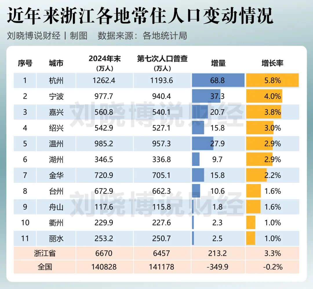浙江是过去4年里人口增长的“满分省”,不仅增量多,全省所有地市都是增长的,这在全国中东部是独一份。