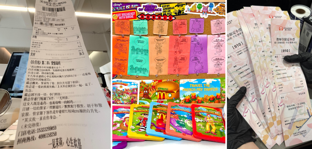 再比如“小票”。最近,茉莉奶白在小票上连载“霸总小说”,情节套路又略带反转,不少消费者还自发在社交平台上上传“续集”,硬是把小票当成了连载小说平台,那张平时随手就扔掉的外卖小票,现在摇身一变竟成了“社交货币”。不仅如此,麦当劳、沪上阿姨、霸王茶姬等头部品牌也纷纷开始在小票上“做文章”。