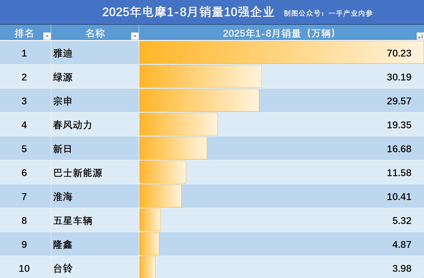 我们来看一下,在2025年的前8个月,国内电摩销量排名前10位的厂商都是谁?