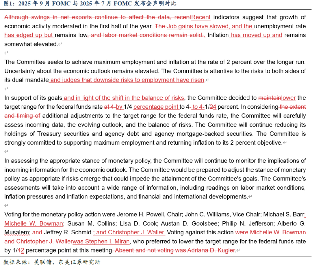 FOMC声明:如期降息25bps,天平从通胀上行风险转向增长下行风险。9月FOMC会议如期将政策利率下调25bps至[4.0, 4.25]%,声明相比7月会议的变化体现在强调就业的下行风险,新增“就业增长有所放缓,失业率有所抬升”,“就业前景的下行风险在增大”,“通胀有所上行”等表述,这与近期的非农就业、通胀数据的变化相符合。因此,“鉴于风险平衡的转变(in light of the shift in the balance of risks)”,FOMC决定下调政策利率25bps。新就职美联储理事Miran投下反对票,认为应降息50bps。