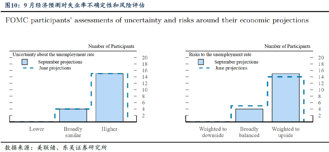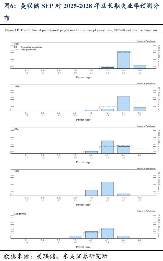 经济预测:预期更多降息将抬升增长与通胀。①产出:将2025Q4至2027Q4的GDP同比增长预测分别上调0.2pct、0.2 pct 、0.1 pct 至1.6%、1.8%、1.9%,新增2028Q4预测为1.8%,即预期未来几年美国经济增长将在1.8%的长期均衡水平附近波动;同时,下调2026、2027年失业率各0.1 pct 至4.4%、4.3%。这一调整显示美联储预期降息将提振经济增长。②通胀:相比6月,仅对明年通胀预测有所调整,将2026Q4 PCE和核心PCE预测值由2.4%上调至2.6%。③风险:对预测不确定性和风险的评估显示,美联储认为未来GDP的下行风险边际缓释,但失业率的下行风险边际强化;通胀上行风险较此前边际缓释。