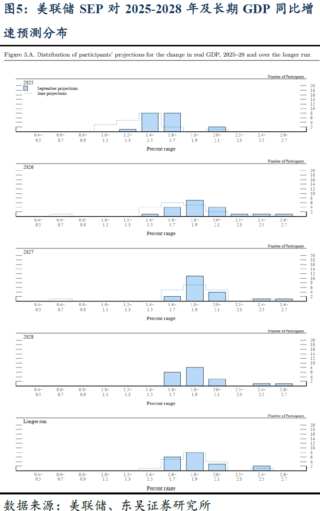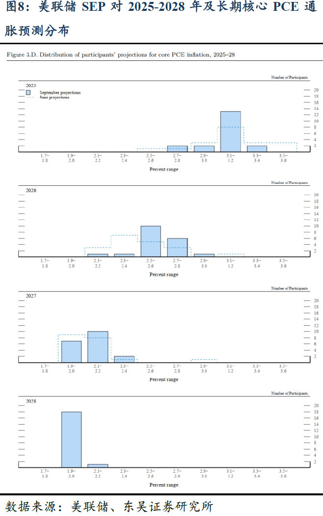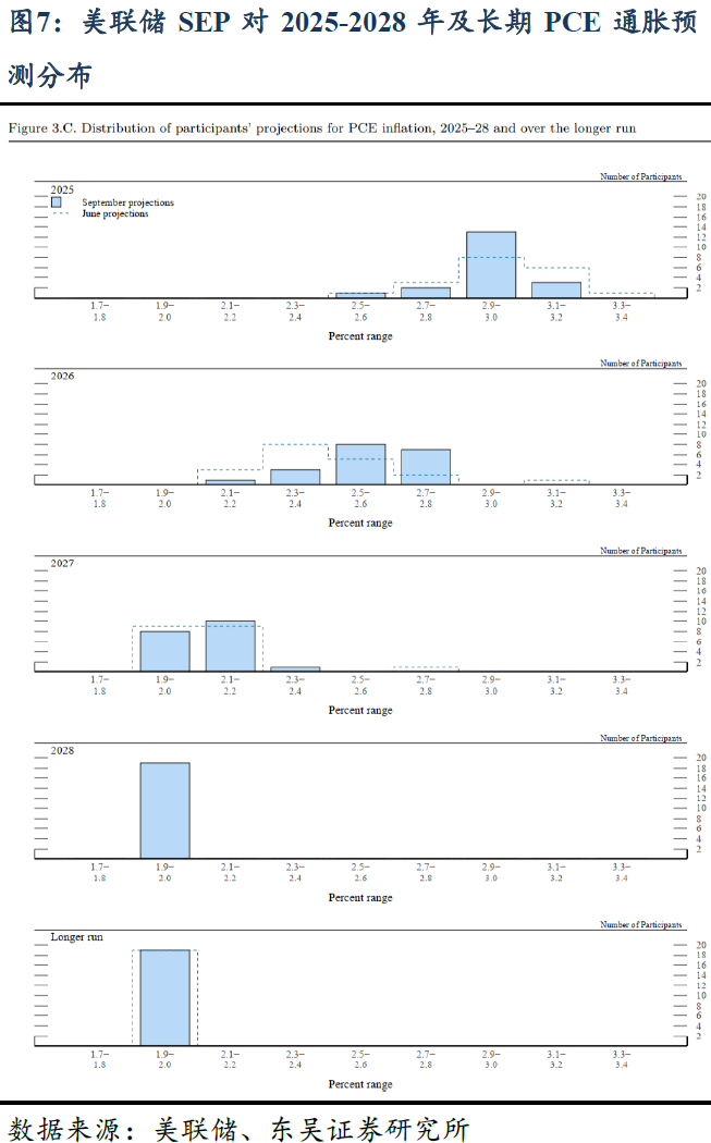 点阵图:年内还有2次降息。点阵图对于2025-2027年的政策利率指引均向下平移25bps,即预期今年3次、明年与后年各1次降息,新增2028年利率指引政策利率在[3.0, 3.25]%不变。①2025年:预期全年0-1-2-3-6次降息的委员分别为1-6-2-9-1人;推测刚入职的Miran指引全年6次降息,即9月开始应连续三次50bps/次的降息。②2026-2028年:预计到2026年累计降息 2-3-4-5-6-7 次的人数分别为2-6-2-4-3-2人,中值为4次,对应政策利率区间[3.25, 3.50]%,即预测2026年仅额外降息一次;预计至2027年降息至[3.0, 3.25]%;此外,新增2028年政策利率指引,认为2028年将不再降息。总体来看,点阵图对未来3年的降息指引分布更加离散。③长期政策利率:预期长期政策利率持平3.0%,且分布的离散性显示对长期利率预测仍存在高度不确定性。
