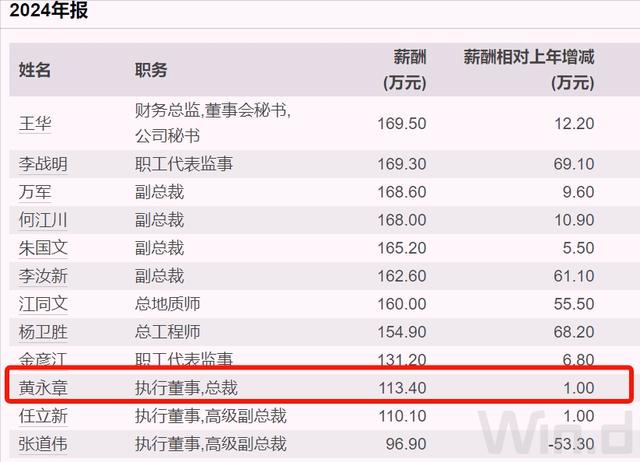 根据年报披露,2024年黄永章的税前薪酬为113万元,在高管中排在第十位。公司薪酬最高是财务总监兼董秘王华,大约169.5万元,比职工代表监事李战明略多2000元,多名高管薪酬超过160万元。