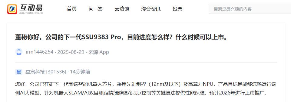 【V观财报|星宸科技:已在研下一代高端智能机器人芯片,预计2026年上市推广】星宸科技9月22日在投资者互动平台回复提问表示,公司已在研下一代高端智能机器人芯片,采用先进制程(12nm及以下)及高算力NPU,产品目标是能够流畅运行端侧AI大模型、针对机器人SLAM/AI双目测距精细避障/识别/控制等关键算法提供性能保障,预计2026年进行上市推广。(中新经纬APP)