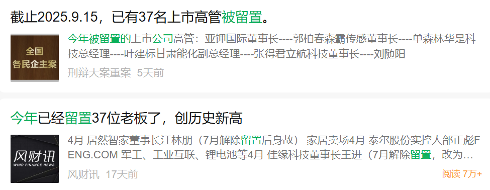 需要注意的是,今年以来有不少企业家被留置,4月居然智家创始人汪林朋被采取留置措施、5月红星美凯龙创始人车建新被留置、7月新里程董事长林杨林被留置。据多家媒体表示,今年已经有37位老板被留置,算上郁发新已经是38位了。