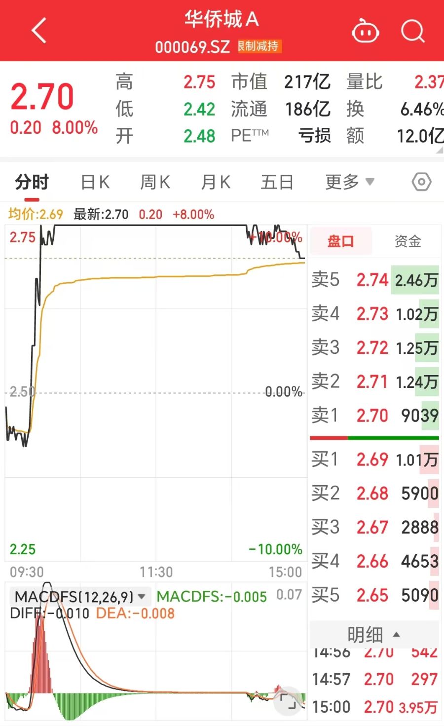 9月22日,华侨城A(000069.SZ)盘中一度涨停,尾盘打开涨停,截至收盘,报2.7元/股,上涨8%,成交额近12亿元。