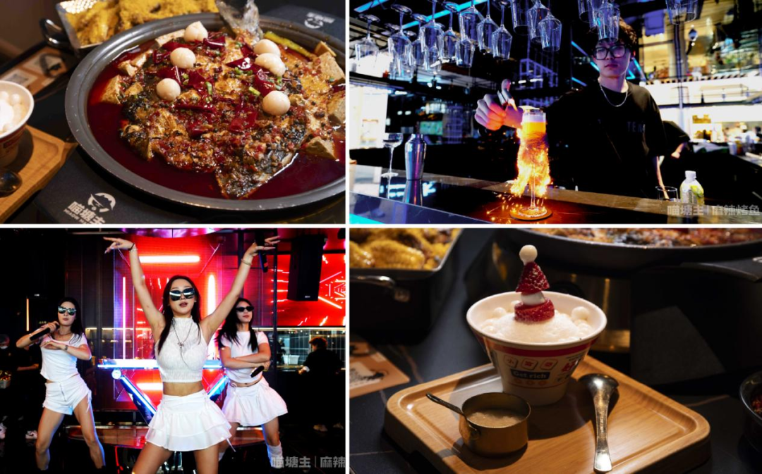 喵塘主麻辣烤鱼的诞生,就基于这样的消费需求。一方面,洞察到年轻消费群体对“氛围”有更丰富的需求,烤鱼赛道在“社交体验”上有空白;另一方面,背靠母公司海底捞强大的供应链、组织力资源,为新品牌的成立提供了支撑。喵塘主采用“烤鱼+社交”的模式,将烤鱼、酒吧结合,不仅产品进行多元化创新,顾客体验上,更是打造“一键转场”模式,日常是用餐场景,大约20-21点后加入声光电,还有打碟、驻唱、互动表演,边吃鱼边蹦迪。人均80多能享受到多重体验。