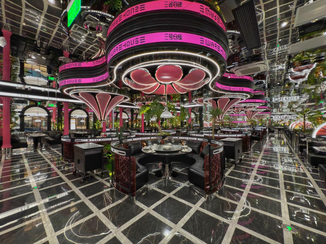 3号仓库·创意中国菜,2014年起源于温州。“仓库”二字,不仅是储存优质食材的物理空间,更是一个有未来感和创意感的未来仓库。如今,这一品牌已在全国开出20多家,成为从下沉市场开到陆家嘴的“魔都最难约餐厅”。走进3号仓库,墙顶都是镜面设计,配合绿植和宛如漂浮岛屿的卡台设计,光影交错,给人一种超现实的赛博朋克感。菜品的设计也十分用心,干冰、液氮等技术的创意使用,让就餐体验惊喜满满。