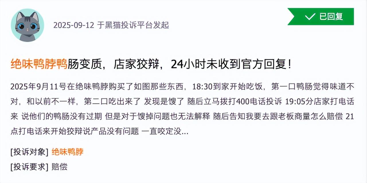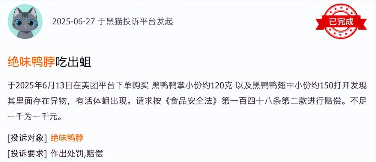 黑猫投诉平台上,有超1573条关于绝味鸭脖的投诉,包括“吃出蟑螂”“变质发臭”“有异物”等问题,甚至有消费者投诉“吃出蛆”。