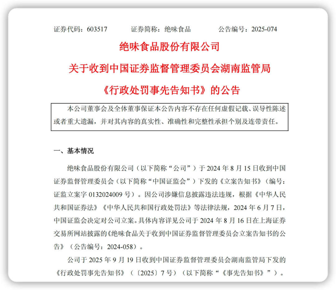 湖南监管局近日下发《行政处罚事先告知书》:绝味食品因涉嫌信息披露违法违规、被处罚400万元,董事长及多人被合计处罚450万元。与此同时,公司股票被实施其他风险警示,A股简称变为“ST绝味”。