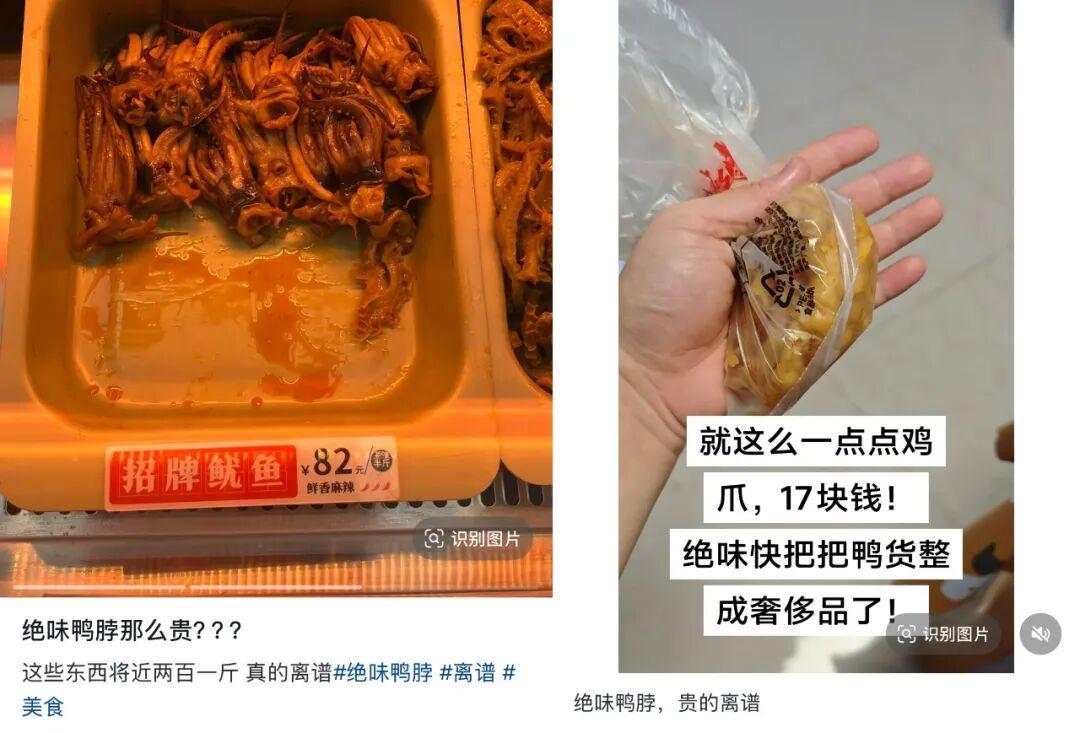 在抖音上,#绝味鸭脖贵# #绝味鸭脖贵得离谱#等相关话题累计播放量超8万次。有网友吐槽:在绝味买卤货经常会超预算,别的品牌按一斤算钱,绝味却按半斤算钱,比如鸭脖24元/半斤,一不留神就买了一斤(48元)。