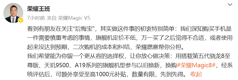 随后,荣耀销售与服务总裁王班在微博上做出了回应。他写道:“我们深知购买手机是一件需要慎重考虑的事情,旗舰机定价不低,万一买了之后觉得不合适,或者使用起来没达到预期,二次购机的成本和纠结,荣耀愿意帮你分担。”