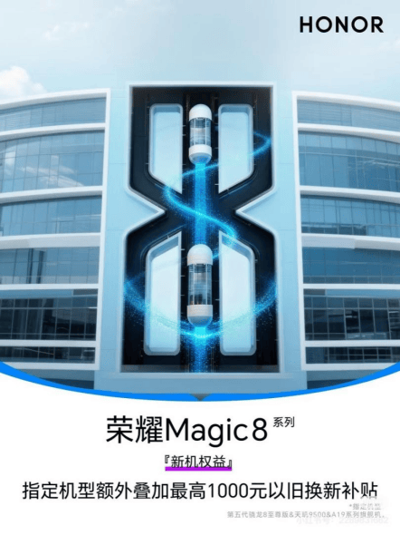 具体来说,用户用搭载第五代骁龙8至尊版、天玑9500、A19系列的旗舰机型参与以旧换新,换购荣耀Magic8,经系统评估后可额外享受至高1000元补贴。