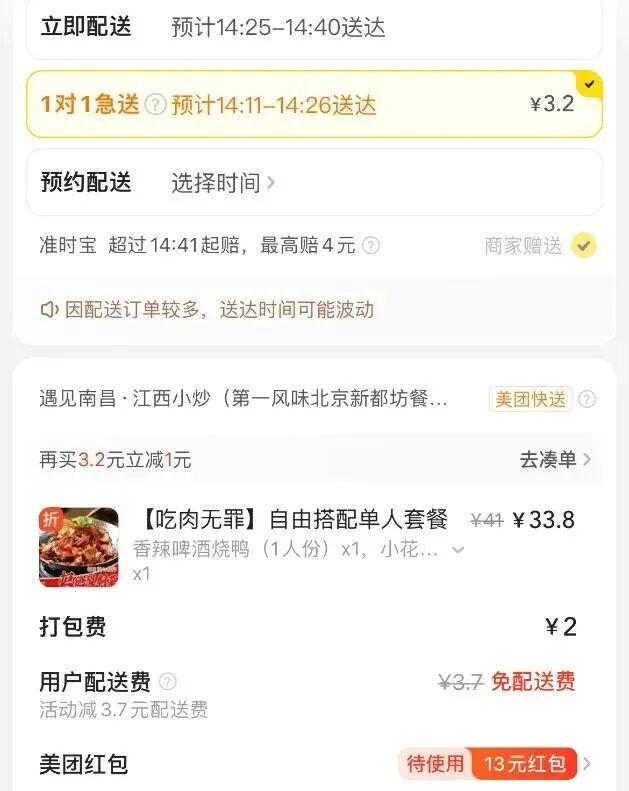 据悉,美团外卖“1对1急送”于今年8月升级上线,核心优势在于通过专属运力支持,保障“一次只送一单”。此次则是“1对1急送”能力首次优化服务于餐饮外卖,美团成为全国首个推出“1对1急送”的外卖平台。只要商家周边有“1对1急送”骑手运力,用户下单时就可以自主自愿勾选该服务,平均支付2-5元,即可节省5-20分钟配送时间。