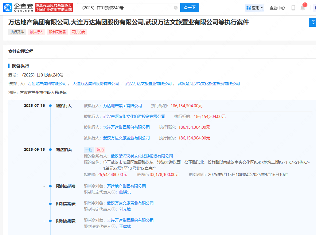 9月28日,据蓝鲸新闻报道,大连万达集团股份有限公司及其法定代表人王健林等被限制高消费。案件流程显示,此前,大连万达集团股份有限公司、万达地产集团有限公司等因此案被强制执行1.86亿。