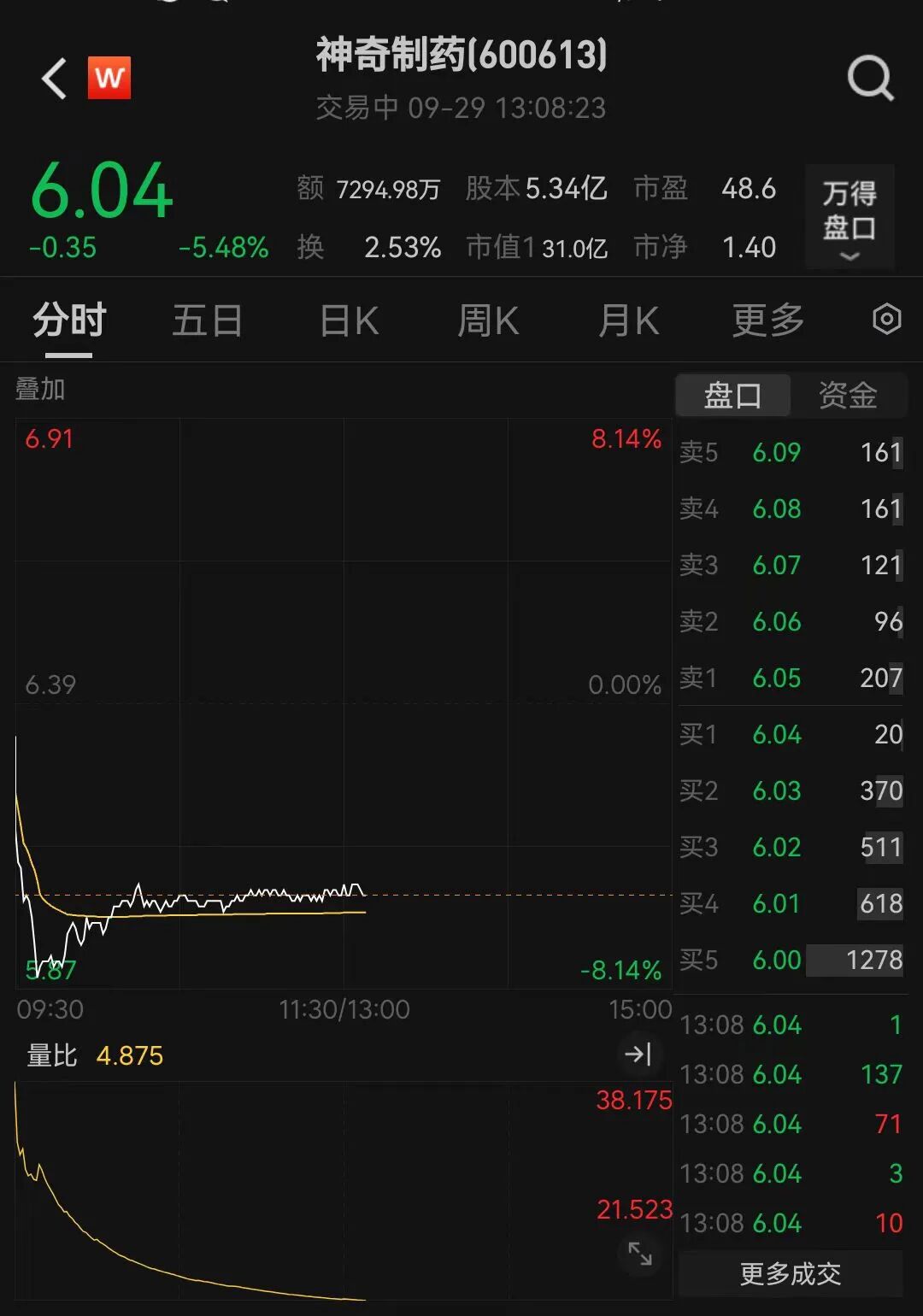 9月29日上午,神奇制药(600613.SH)盘中股价跌幅一度超过7%,截至午间收盘,跌幅仍超过5%。