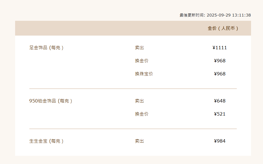 国际金价的上涨助推国内足金饰品价格攀升。9月29日,红星资本局注意到,多家国内品牌金店足金饰品价格每克已超1100元。其中,周生生(00116.HK)足金饰品价格升至1111元/克;老凤祥(600612.SH)足金饰品价格为1110元/克;周大福(01929.HK)、豫园股份(600655.SH)旗下老庙黄金足金饰品价格为1108元/克。