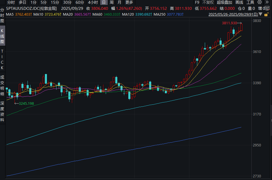 红星资本局9月29日消息 今日,伦敦现货黄金、COMEX黄金期货双双上涨。截至发稿,伦敦现货黄金突破3800美元/盎司,盘中最高涨至3811.93美元/盎司,COMEX黄金期货最高涨至3840.4美元/盎司。