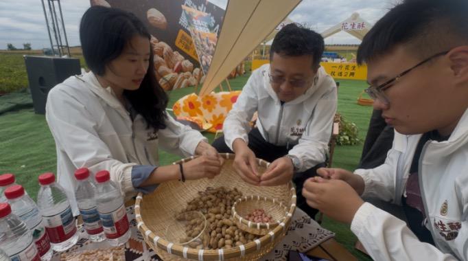 在这片黑土地上,记者和小白沙花生来了场“亲密接触”,脚踩泥土,下地采摘了小白沙花生,又按照无破损、无瘪粒、大小均匀等相关指标选择了其中的优质花生作为生产花生酥的原料。