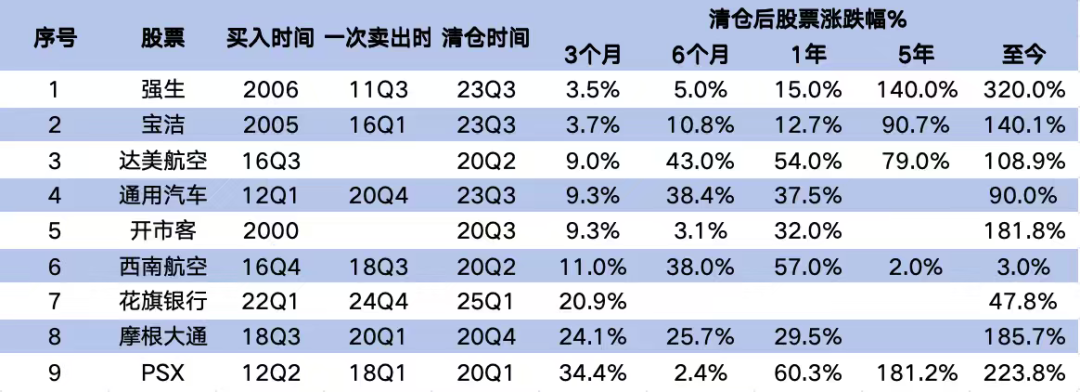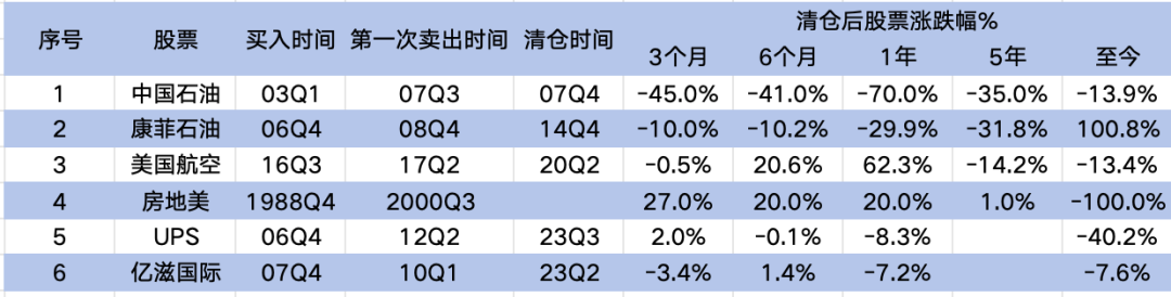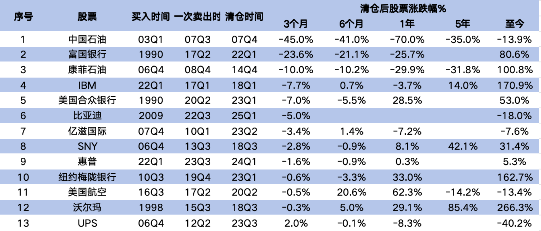 为了解答巴菲特清仓行为是否具备“逃顶”的普遍性,我们对 2006年后伯克希尔基金清仓的 24 只重仓股进行了统计分析。
