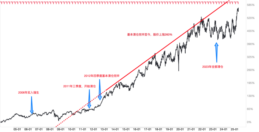 但2011年三季度开始,巴菲特进入持续减仓阶段,到2012年四季度清仓式减到只剩327,100股,最终在2023年3季度完成全部清仓。持仓6年间,强生股价累计的涨幅约45%。