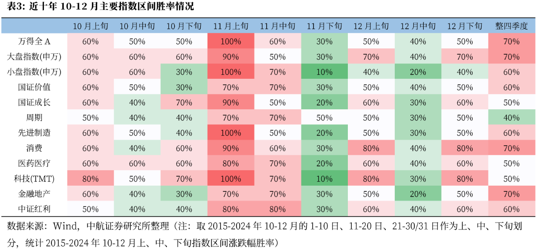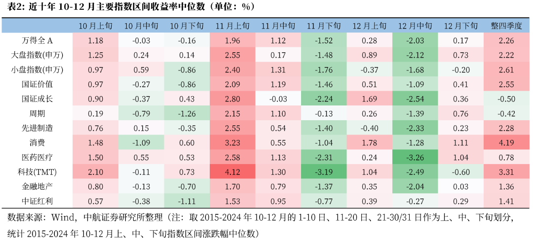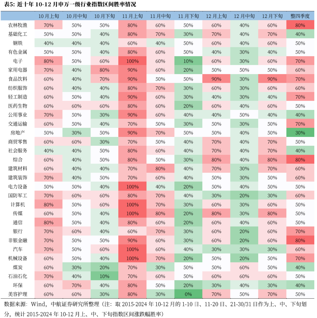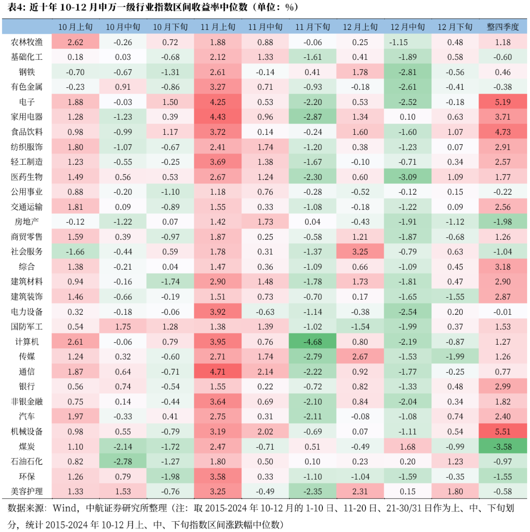 进一步,我们复盘近十年A股每年四季度的大盘指数、主要风格、产业大类以及31个申万行业在四季度各月上中下旬的旬度中位数和胜率的表现,以寻找是否具有一些较为明显的日历效应。