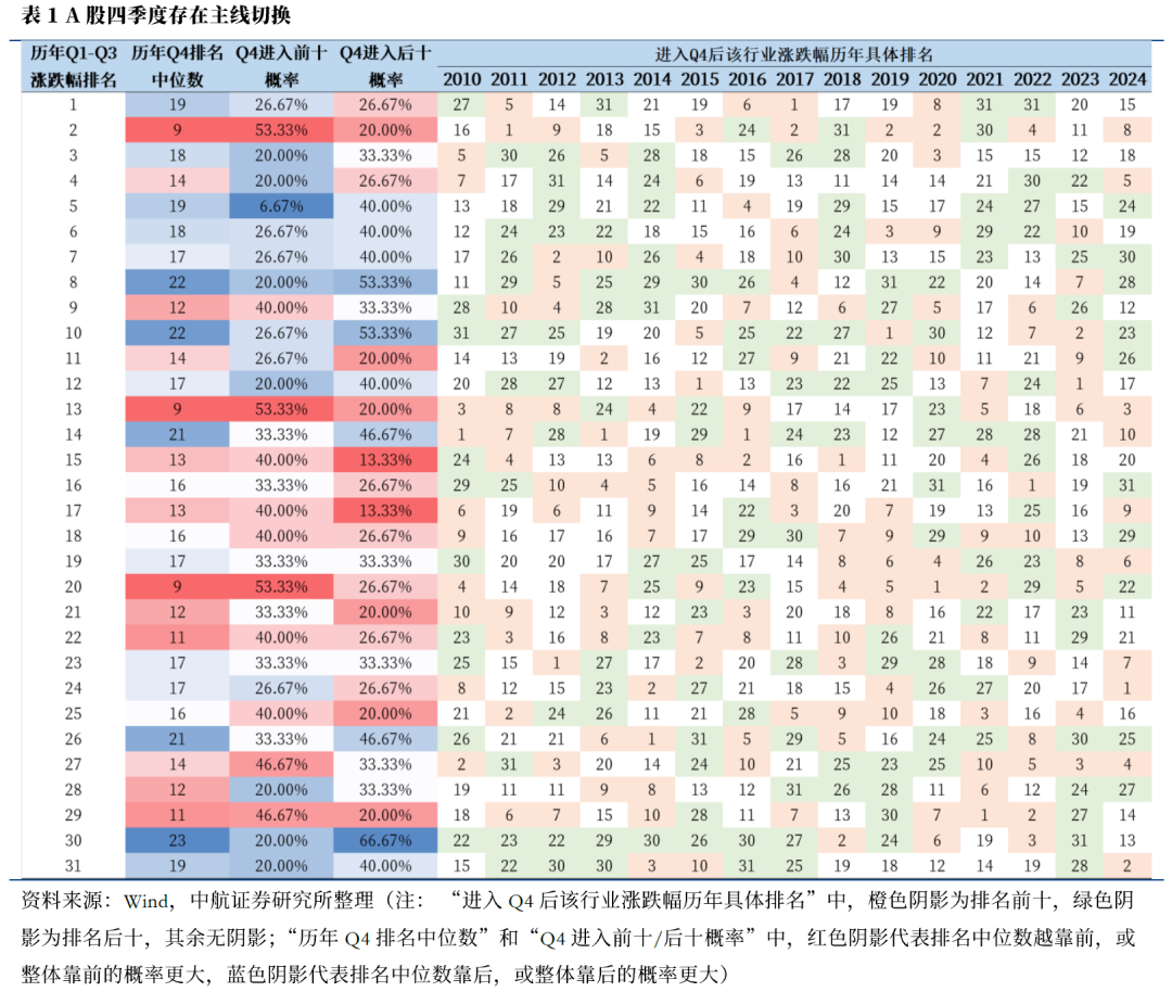 首先,复盘显示,A股四季度主线较前三季度往往出现较明显的切换,资金的高切低行为主要流入前三季度市场涨幅13至25名,即中间偏后的行业。这或因为,12月重要会议为下一年的宏观政策和重点工作任务安排定下基调,很大程度上决定着下一年的年度投资主线,同时在“估值切换”下,资金对下一年提前布局。而机构的年末考核机制助推了四季度主线切换的趋势。