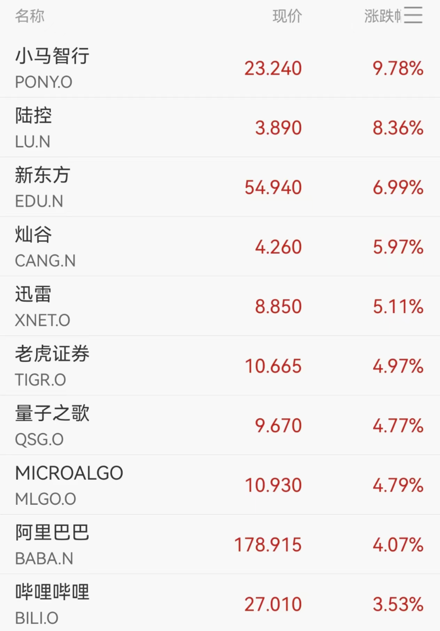 中概股集体上涨,纳斯达克中国金龙指数一度涨超2%,小马智行涨近10%,新东方、迅雷、阿里巴巴等涨超4%。