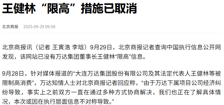 虽然第3天万达就发布消息澄清,说这次限高是个大乌龙,是因为万达下属公司的经济纠纷导致,目前对老王的限高已经解除。