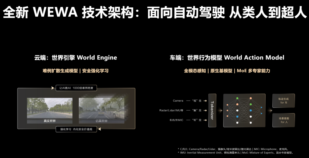 WA则是部署在车端的World Action Model世界行为模型,它采用MoE多专家结构,在不同场景下调用相应专家能力,发挥多种异构传感器的全模态感知,让系统能够看得懂、想得远。
