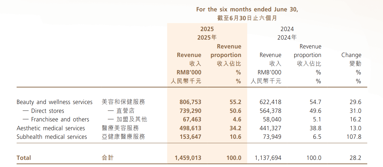 从业务范围来看,美丽田园的收入主要来自三大板块:美容和保健服务、医疗美容服务、亚健康医疗服务。其中,美容和保健服务被视为集团“双美+双保健”商业模式的核心流量入口,也是美丽田园的收入主要来源。报告期内,得益于客户数量的提升,美容和保健服务收入同比增长29.6%至8.07亿元,在总收入中的占比约55.2%;毛利率提升1.8个百分点至42.1%。