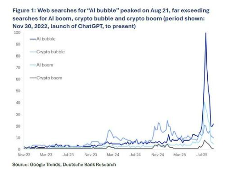 在金融结构性风险日益凸显的同时,关于AI泡沫的公开讨论却在降温。德意志银行分析师Adrian Cox指出,全球范围内“AI bubble”的网络搜索量已从2025年8月的高点下降了85%。换言之,“讨论AI泡沫的泡沫”本身已经破裂。