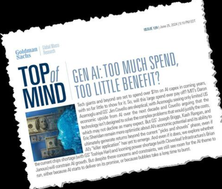 第一次大规模的担忧潮涌现在2024年6月。当时,高盛发布报告,直指生成式AI是否是“投入太多,获益太少”的资本无底洞,即一个可能永远无法为投资者带来长期正回报的巨坑。这一质疑在科技界投下了一枚震撼弹。
