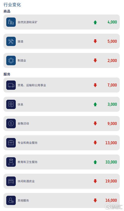 建筑业就业人数9月减少0.5万人,8月增加1.6万人;薪资增速年率中值9月为4.5%,8月为4.4%。 制造业就业人数9月减少0.2万人,8月减少0.7万人;薪资增速年率中值9月为4.7%,8月为4.7%。 贸易/运输/公用事业就业人数9月减少1.3万人,8月减少1.7万人;薪资增速年率中值9月为4.3%,8月为4.2%。 金融服务业就业人数9月减少0.9万人,8月减少0.2万人;薪资增速年率中值9月为5.2%,8月为5.1%。 专业/商业服务就业人数9月减少1.3万人,8月增加1.5万人;薪资增速年率中值9月为4.2%,8月为4.2%。